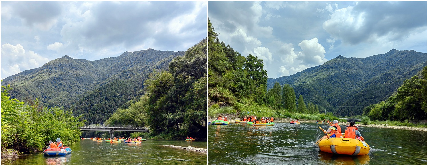 此次行程兩天一夜,在導(dǎo)游的帶領(lǐng)之下,我們首先來到石臺縣大演鄉(xiāng)剡溪村的西黃山漂流景區(qū)。下榻之時,正值正午時分,景點兩岸青山疊嶂、風光旖旎、草木蔥蘢、景色怡人。協(xié)普家人們換好服裝,穿上救生衣,在工作人員的協(xié)助之下,或一家?guī)卓凇⒒蛉搴糜呀Y(jié)伴乘筏而行、泛舟漂流,水面波光瀲滟、河底各式各樣的鵝卵石靜靜地躺著,日復(fù)一日被溪水沖刷,變得光滑又圓潤,坐在游筏里俯身去看,“瞧,有不少小魚正悠閑地在它的身上游過呢”,其水之清澈由此可見一斑。此次漂流全程3公里,在漂流過程中,除了欣賞到秀美的湖光山色,體驗到劈波斬浪的沖刺暢快感,更讓人愜意的是,在河灘淺水區(qū)域漂流回緩,協(xié)普家人們正帶著孩子們,在這悠閑的時光里愉快的打起了水仗,孩子們帶上了自己心愛的水槍玩起了水槍大戰(zhàn),有人帶來了水盆和水瓢,于是乎水槍大戰(zhàn)現(xiàn)場演變成了潑水節(jié),歡笑聲、尖叫聲蕩漾在山谷之間,在這愜意的時光里,平日的壓力和煩擾仿佛已煙消云散。