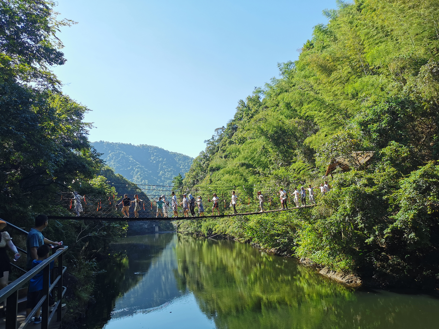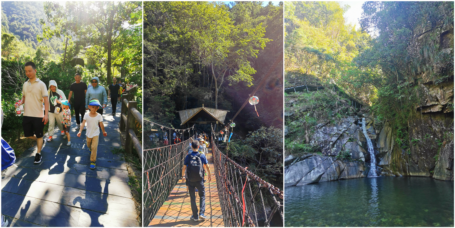 晚上體驗了農(nóng)家樂菜肴和當?shù)靥厣袼藓?,第二天早早的起床,吃完早餐集合,大家興致勃勃地乘著大巴來到了醉山野景區(qū),這里是安徽省內(nèi)第一個5D玻璃橋皖南地區(qū)最大的瀑布群。在進入景區(qū)之前,有一段鄉(xiāng)村道路,徒步的過程頂著早上八九點的太陽就覺得酷暑難耐,然而當我們正式踏入景點,走在山谷間的步棧道上,遠處是蔥郁的山林、近處是流動的溪水、頂上是一片陰涼,只聽見大朋友們小朋友們都在說“好涼快啊,好涼快??!”沿著步棧道繼續(xù)前行,來到了千花橋,這里是著名的網(wǎng)紅打卡點,小朋友們都絡(luò)繹不絕的脫下鞋子、挽起褲腳,下水嬉戲游玩。有合影拍照的、有撿起小石片仍水花的、還有在石頭縫里抓螃蟹的。大家坐在陰涼的石頭塊上休憩閑聊,甚至玩笑起來,富硒山水、天然氧吧,以后老了退隱山林一定要來這里休養(yǎng)生息。有人不被沿途風景耽誤過久,繼續(xù)往山上攀爬,他們到了山頂穿過了玻璃棧橋,體驗了“一覽眾山小”的視野和格局。由于兩個月沒有下雨,雖有山谷溪流卻看不到震撼的黃崖瀑布群,實屬遺憾,卻也給大家下次再來此一游留下了機會。