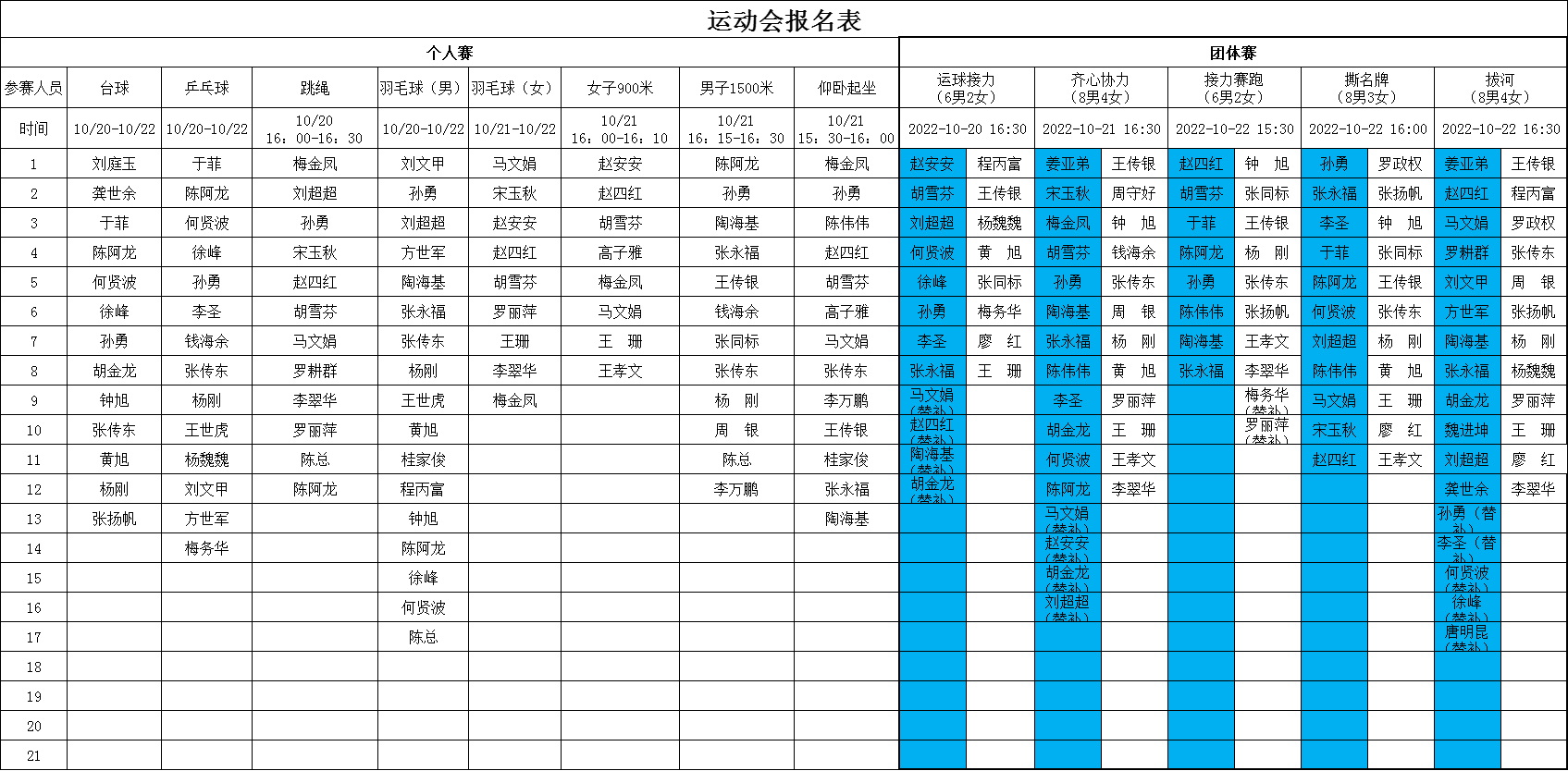 金秋送爽、丹桂飄香,在這秋高氣爽的美好時(shí)節(jié),我們滿懷喜悅的心情迎來了公司2022年度秋季職工運(yùn)動(dòng)會(huì)。本屆運(yùn)動(dòng)會(huì)分個(gè)人賽、團(tuán)體賽,自10月20日至22日共持續(xù)3個(gè)下午,比賽項(xiàng)目包括乒乓球、羽毛器(男子、女子單項(xiàng))、臺(tái)球、跳繩、仰臥起坐、女子900米,男子1500米長(zhǎng)跑8項(xiàng)個(gè)人賽,還有齊心協(xié)力、運(yùn)球接力、女子接力賽、男子接力賽、撕名牌、拔河共6項(xiàng)團(tuán)體賽。在歷屆運(yùn)動(dòng)會(huì)的賽程、賽項(xiàng)上都增加了新的活動(dòng)亮點(diǎn),從參賽名單上不難看出,全體協(xié)普家人的熱情和參與度都異常高漲。